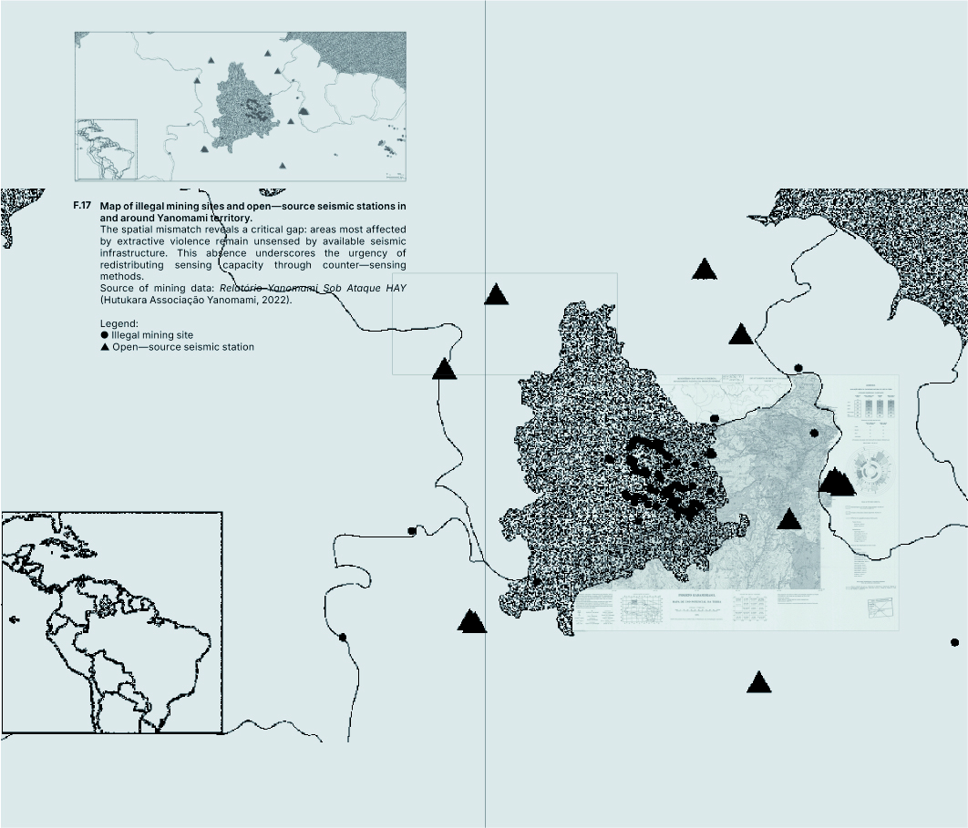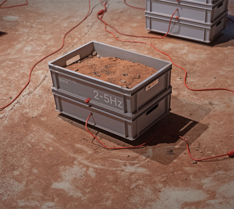 Mercury from illegal gold mining spreads through Yanomami rivers, soil, and bodies, while the ground already carries the tremors of the machines causing this harm. This work reappropriates seismic sensing to detect those subsonic vibrations, using open-source data and machine learning to turn them into sound. The signals animate soil-filled containers that release golden dust—traces of extraction transformed into resistance. As the dust settles on surfaces and visitors’ shoes, a decolonized geological perception emerges: one that listens to the ground and senses what lies beyond visibility.